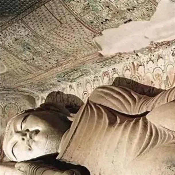 敦煌莫高窟第158窟卧佛像着通肩袈裟,右卧通壁佛床上。左手覆左股,手指疏密有致,右手直伸颜下与枕间累足而卧。卧枕分上下两叠,是释迦涅槃时所枕袈裟。体态修长,表情恬静,两眼微开似“小疲倦暂寝息时”,体现了如来常住无有变易的大成佛教涅槃观。