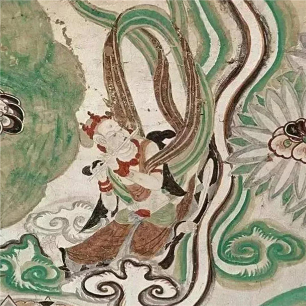 敦煌莫高窟第158窟飞天,飞天共三身,位于西壁裟罗树间菩萨列像上方的南、中、北侧。飞天或口吹横笛,或捧持花盘,或手持璎珞。衣带附随祥云翻飞飘逸,给人以强烈的动感。各飞天右侧更有衔花的大雁。
