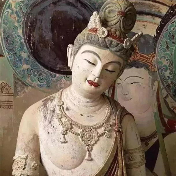 敦煌莫高窟第45窟的大势至菩萨,此尊头戴宝冠,发梳高髻,上身半裸,肌肤圆润光洁,佩饰披巾、璎珞、臂钏、手镯等物,俊美中蕴含着女性的妩媚。他目光低垂,神情专注,仿佛正在侧耳聆听朝拜者的倾诉。他是慈悲和善良的化身,是理想和艺术创作的完美结晶。