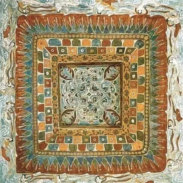 敦煌莫高窟第322窟藻井井心,是由忍冬藤蔓组成莲花形图案,外沿分别绘方格花纹、联珠纹、垂角纹及帷幔。帷幔外沿又画出十六身飞天环绕藻井飞行,四披画千佛。井心层次丰富,有动有静,富于变化,色彩明净,体现出唐代艺术欣欣向荣的精神。