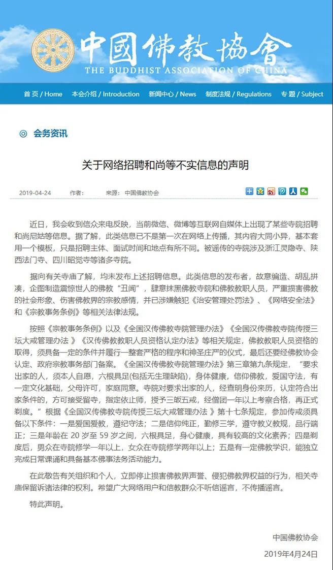 早在2019年,中国佛教协会就发布声明称,上述寺院均未发布过这些招聘信息。此举已涉嫌触犯《中华人民共和国治安管理处罚法》《中华人民共和国网络安全法》和《宗教事务条例》等相关法律法规。希望广大网络用户和信教群众不听信谣言,更不传播谣言。