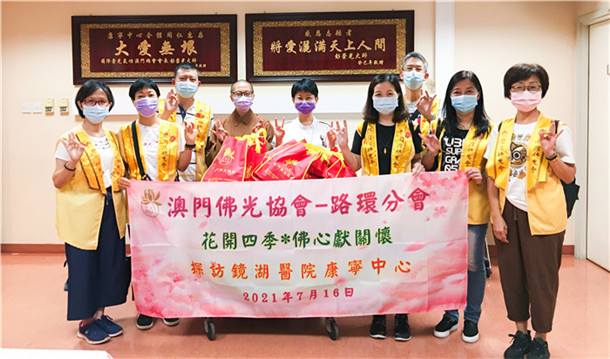 2021年7月16日下午,澳门佛光协会举办“花开四季.佛心献关怀”,由辅导法师妙为法师与路环分会会长许凤鸣,带领干部一行8 人,前往探访镜湖医院康宁中心。