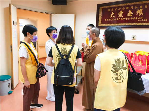 护士长黄明花引领佛光人进入病房,逐一探视35位病友,献上关怀与慰问,与他们交谈,并送上结缘品传递浓浓的祝福;法师带领众人称念观音圣号,祈愿佛菩萨加庇,令病友安心自在,病友、家属亦感动合掌,在念圣号中觉得宽心,各位病友与家属皆对佛光人的关怀与祝福表示感谢,其中有一位更欢喜表示懂得称念阿弥陀佛及地藏菩萨圣号,佛光人随即与他一起称念七遍阿弥陀佛与地藏菩萨圣号,实践“给人信心、给人欢喜、给人希望、给人方便”的四给信条。