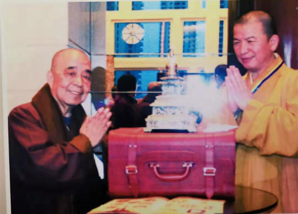 觉悟佛教网向智慧长老赠送世界和平吉祥塔(左:智慧长老,右:明光法师)