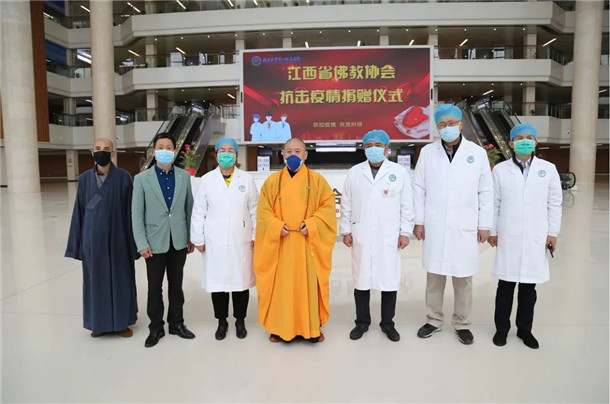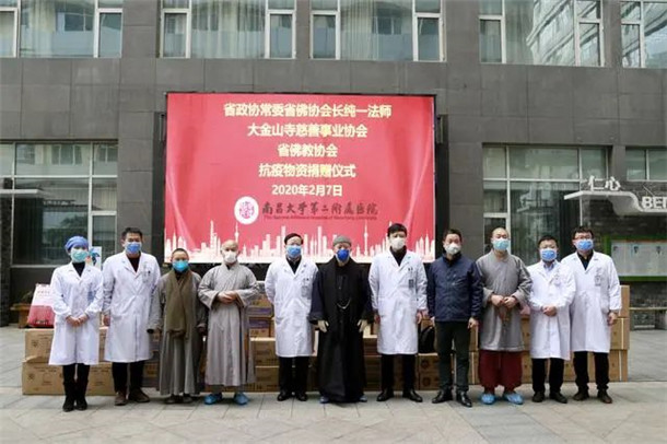 纯一法师代表江西省佛教协会向南昌大学第一附属医院捐赠423万余元用以疫情防控