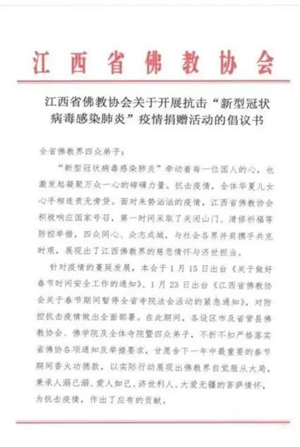 1月28日,江西省佛教协会召开紧急办公会议,向全省佛教界四众弟子发出《江西省佛教协会关于开展抗击“新型冠状病毒感染肺炎”疫情捐赠活动的倡议书》,广泛募集防疫紧缺物资和资金,支援疫区。