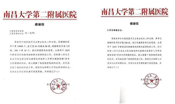 2月7日,省佛协组织向南昌大学第二附属医院捐赠医用口罩10000只,蓝月亮84消毒液96瓶,滴露牌洗手液120瓶,N95口罩20只,医用防护服1000套,安立乙醇消毒液800瓶,护目镜115副。
