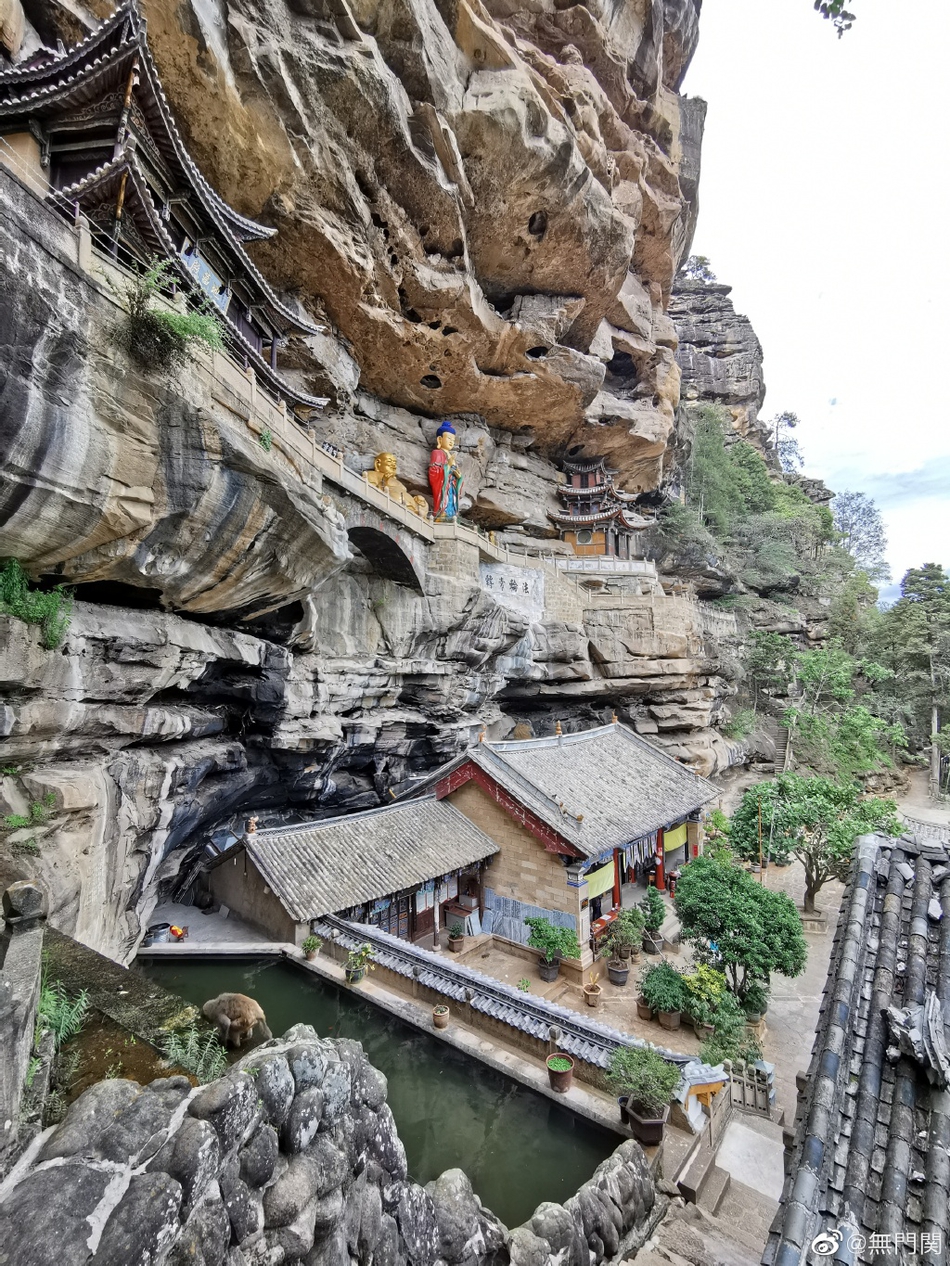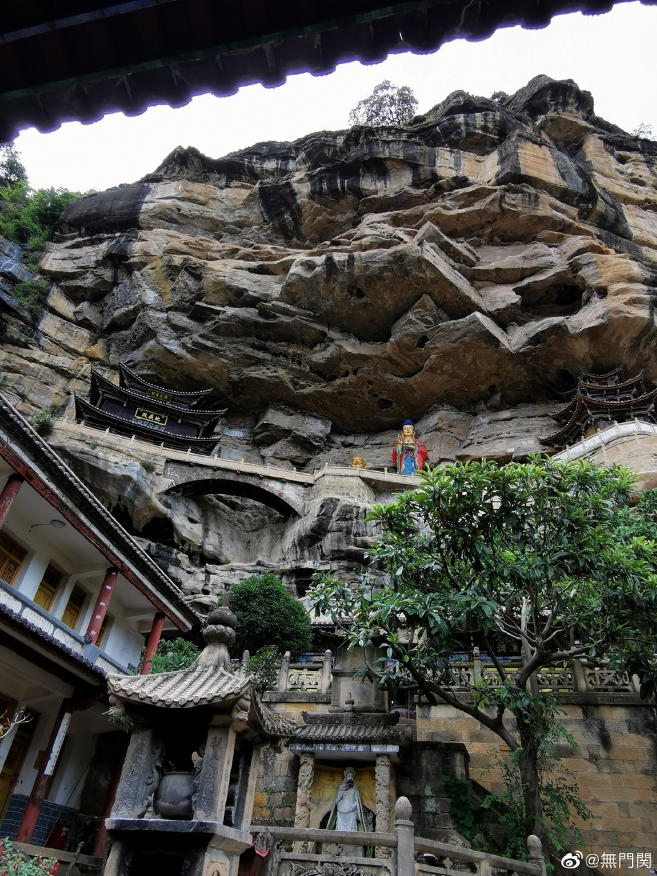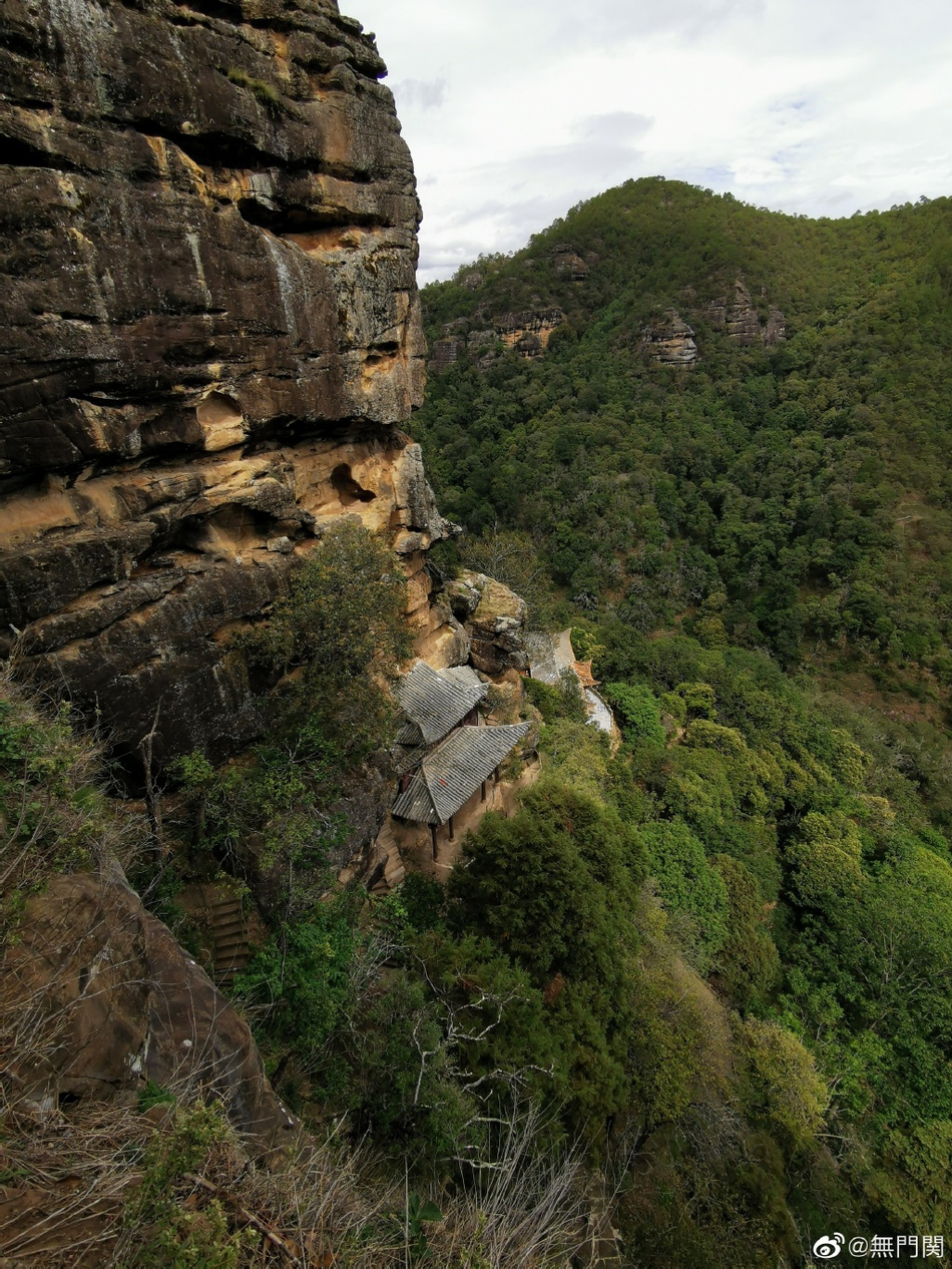 云南宝相寺又名石宝寺,因建筑奇险,被誉为“云南的悬空寺”。为明正统年间鹤庆土知府高论所建,寺建在佛顶山高耸险峻的悬崖上,令人目眩,寺坐西朝东,进山门而至天王殿,大雄宝殿均层层升高,弥勒殿与玉皇阁则凌空建造在崖内,需从左右攀岩扶壁方能到达。