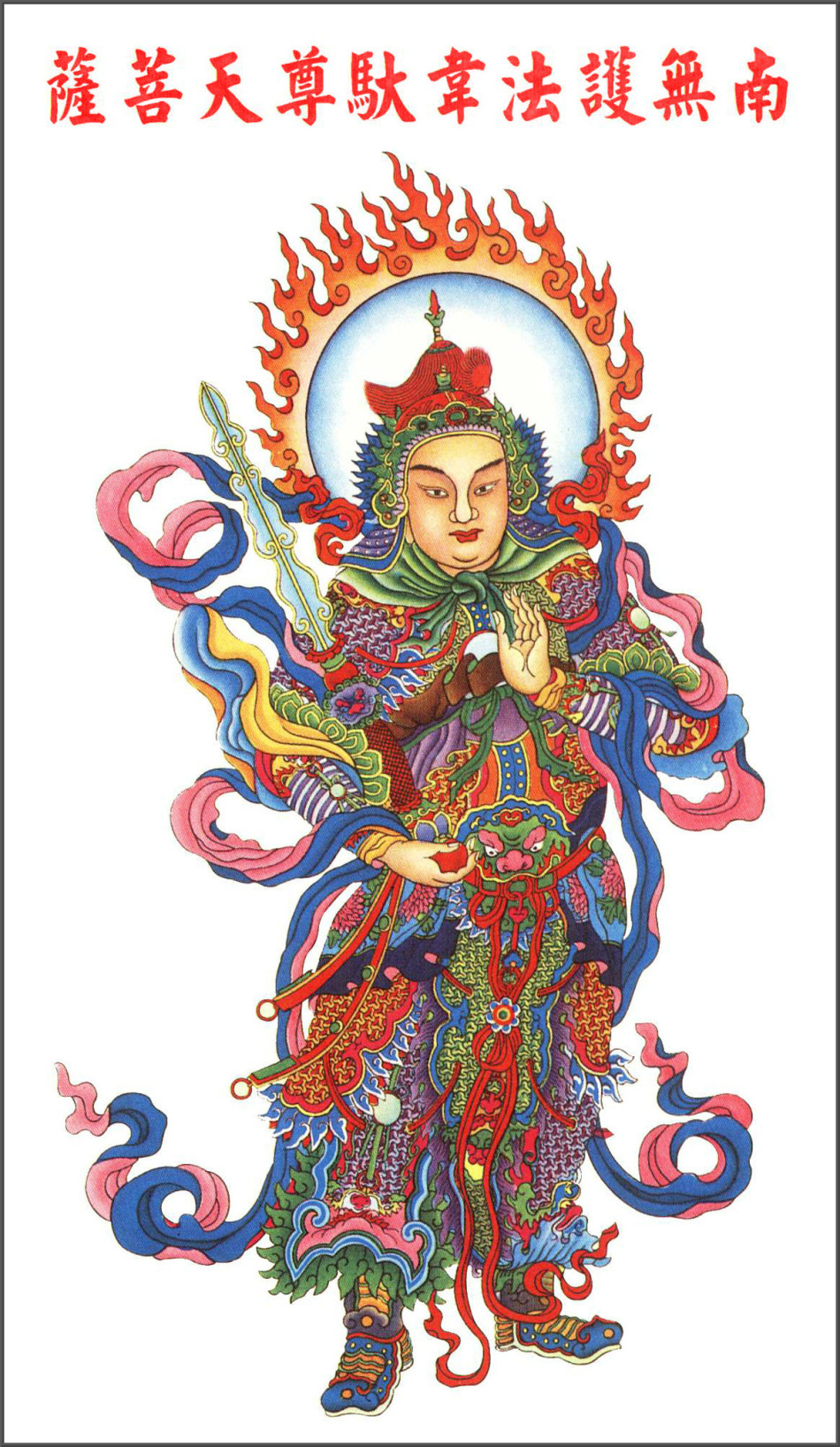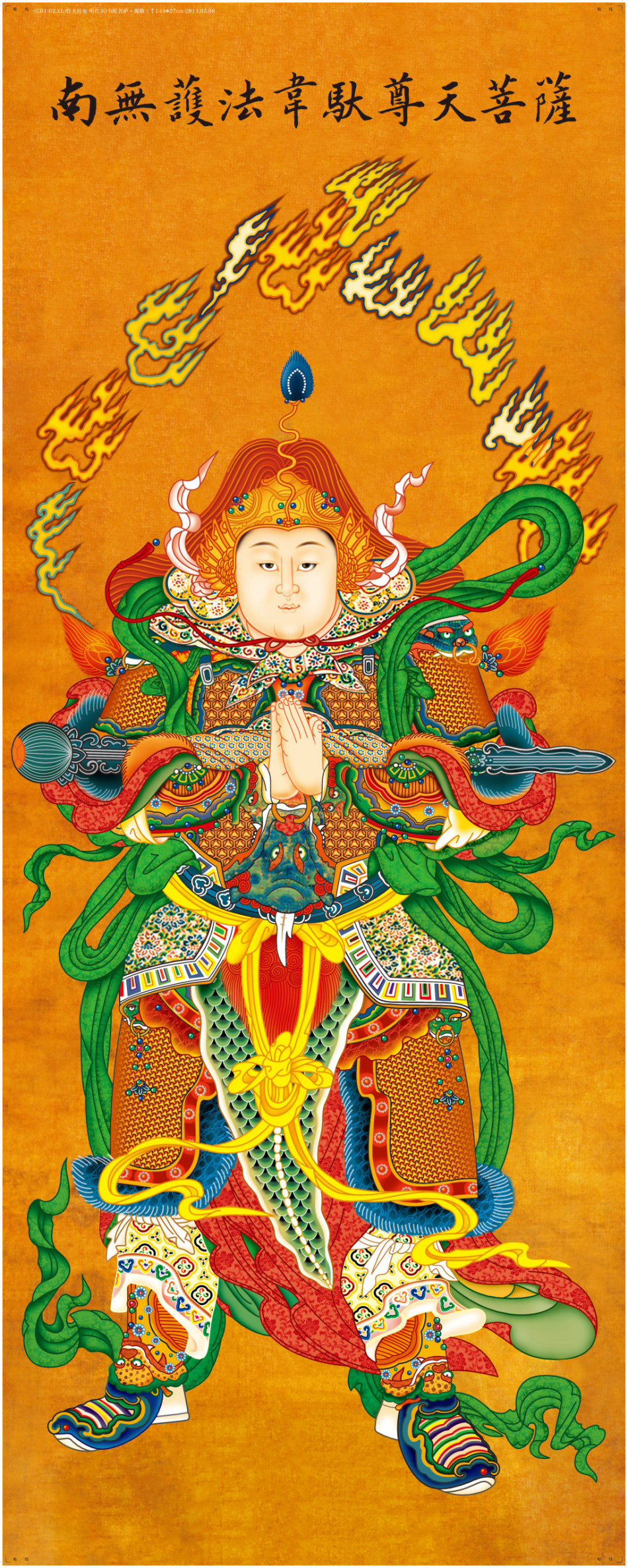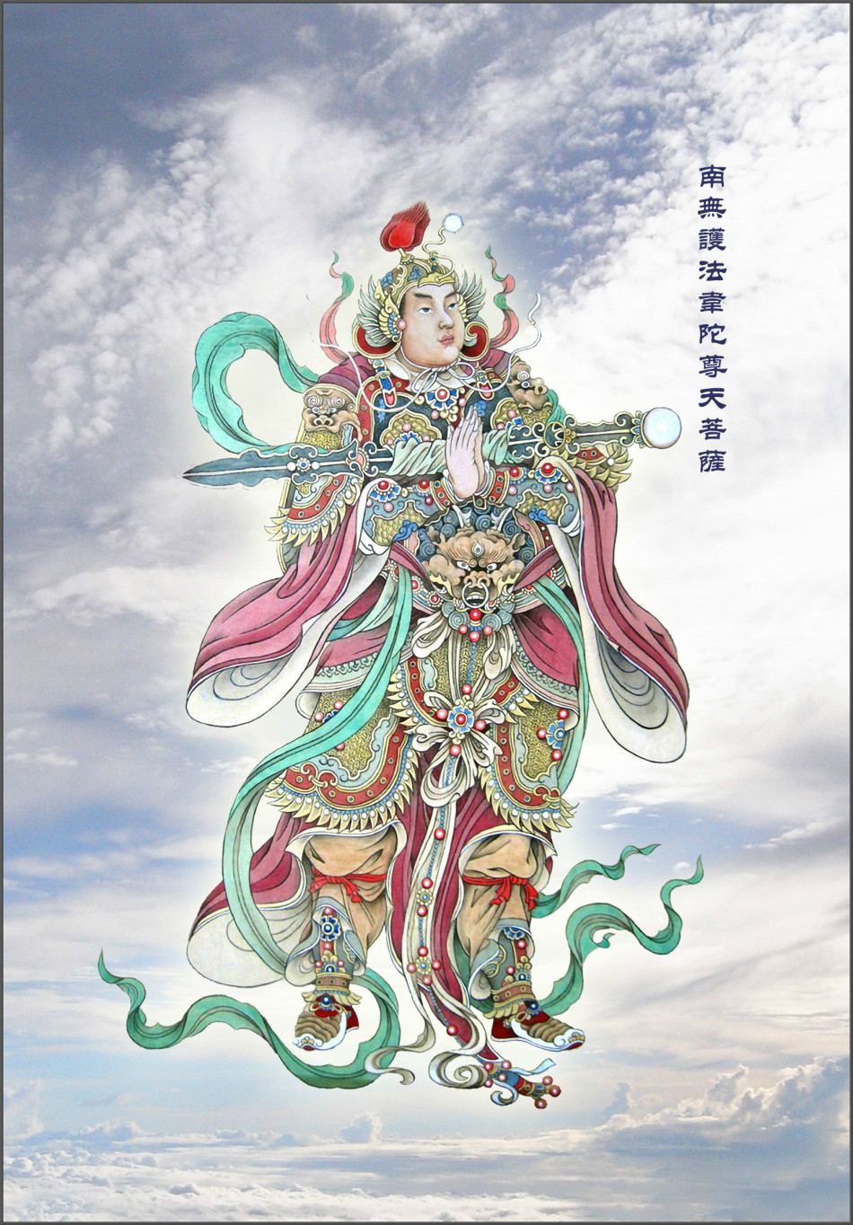 汉化的韦驮天为穿戴盔甲的少年武将形象,手持法器金刚杵,或双手合十将杵搁置肘间(表示该寺为十方丛林,接待寺),或以杵拄地(表示该寺为非接待寺)。