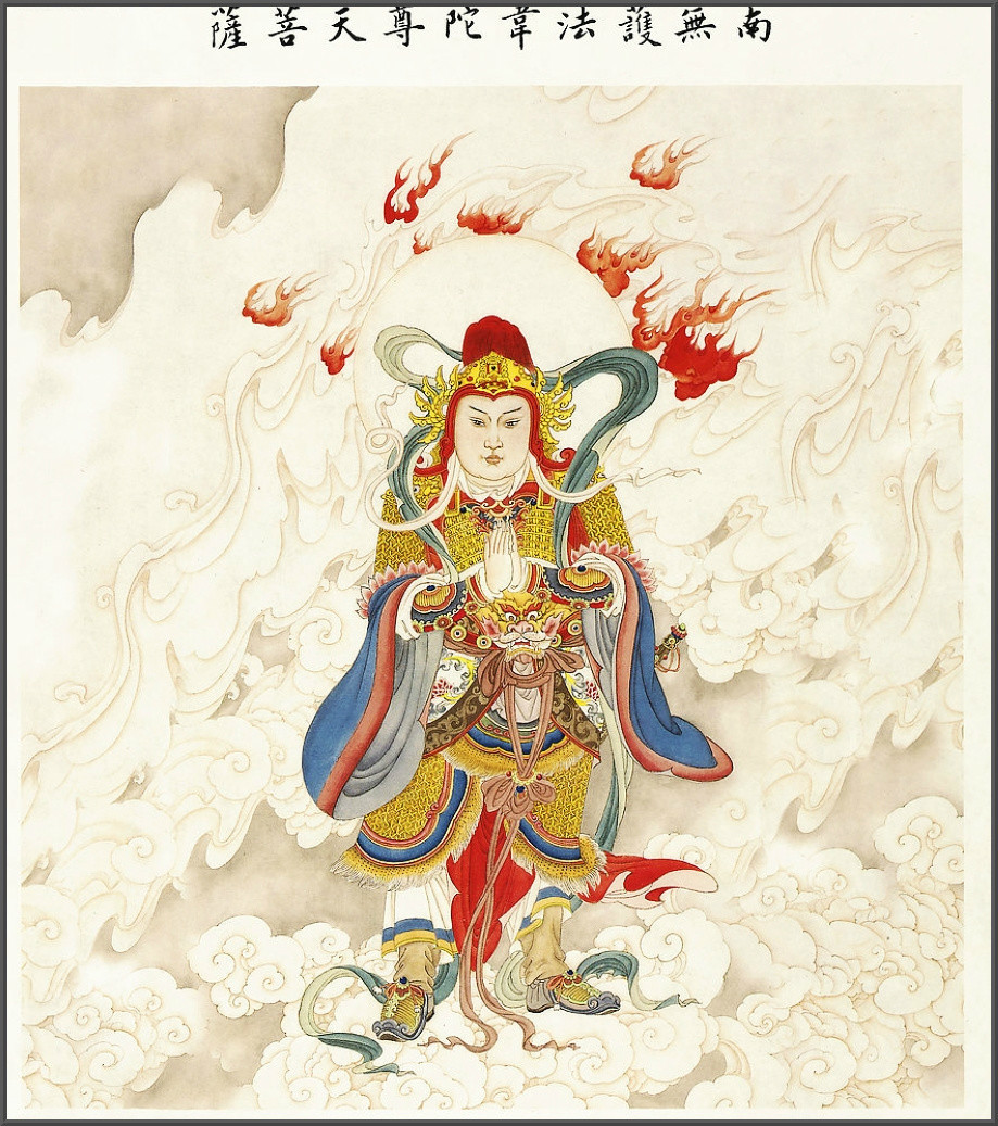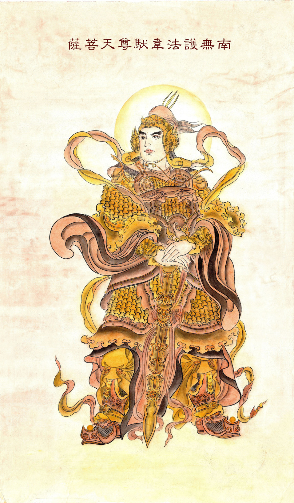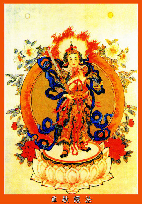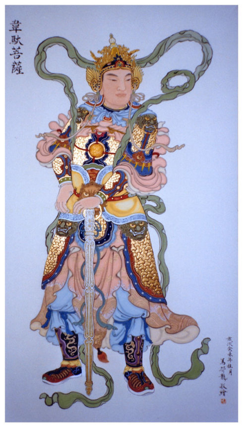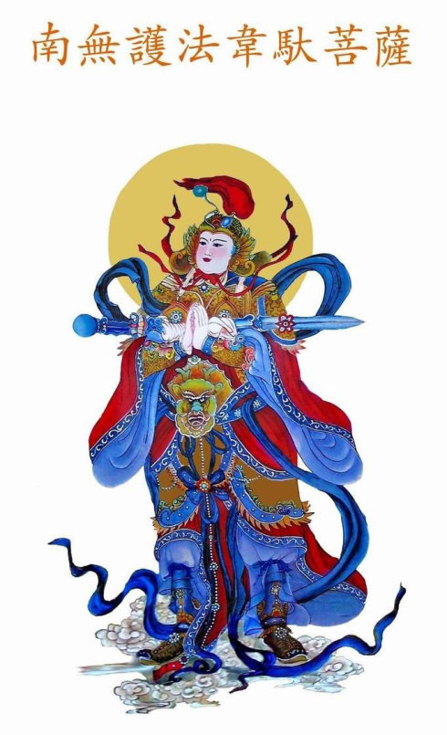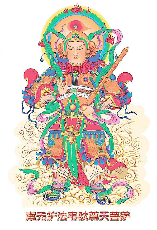 从宋代开始,中国寺庙中供奉韦陀,称为韦陀菩萨,常站在弥勒佛像背后,面向大雄宝殿,护持佛法,护助出家人。