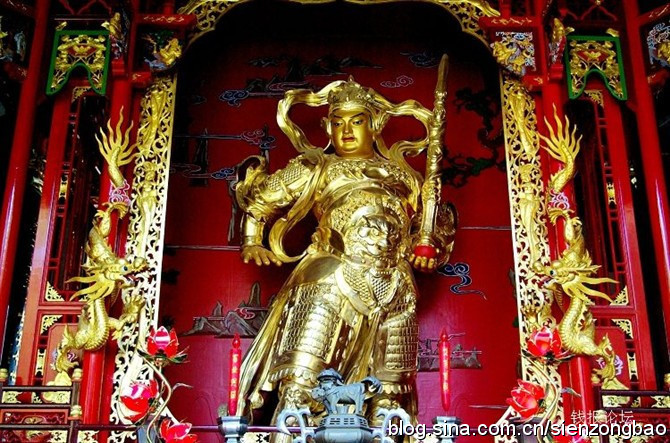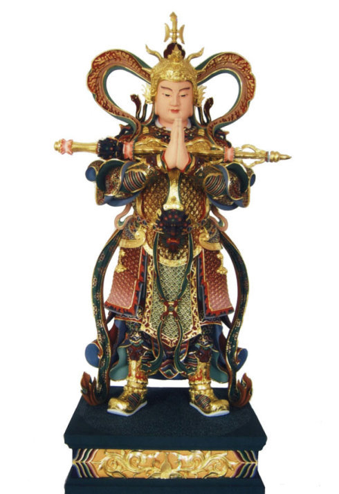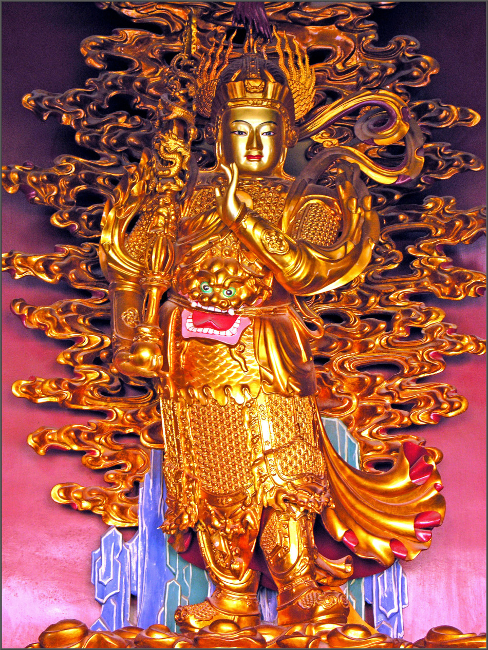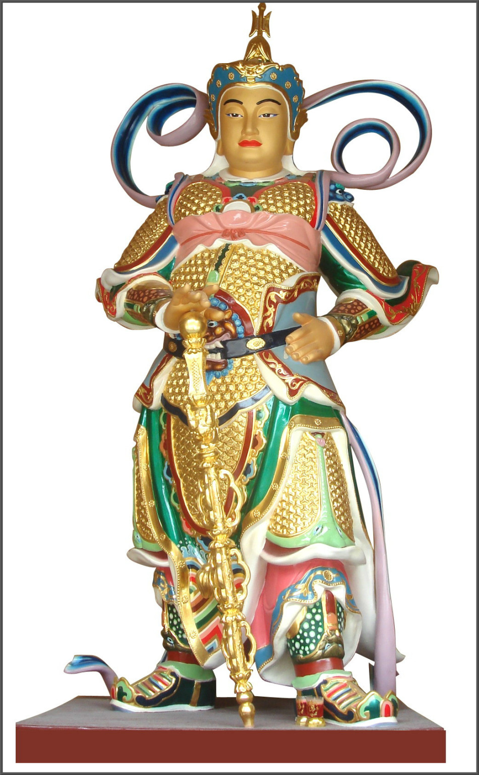 韦陀菩萨通常置于天王殿大肚弥勒佛像背后,脸朝向大雄宝殿。