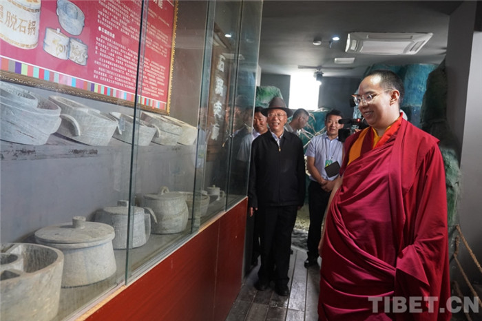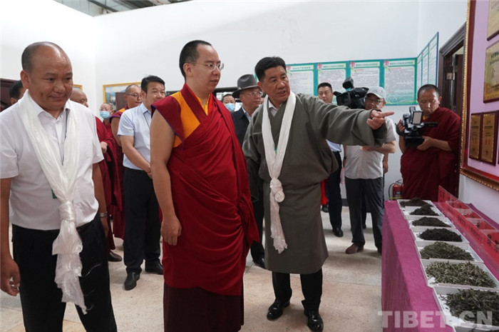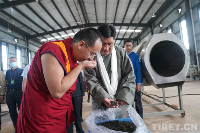 图为十一世班禅在茶场内察看茶叶加工情况 摄影:王淑