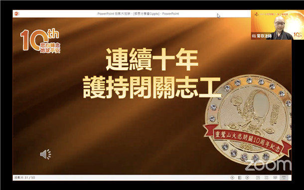 在6月12日的分享会上,由常存法师线上授勋,此外,也表扬10年来护持的志工们,由当家常存法师线上唱名,萤幕中播放授勋人名字,庄严隆重的氛围,也让全球信众共享其荣耀,滋养了大家服务奉献的心。