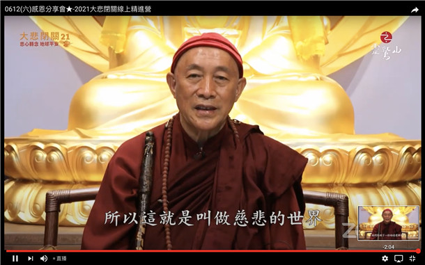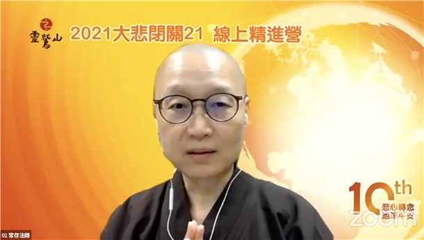 灵鹫山当家法师常存法师说,2021年是大悲闭关的第10年,因应疫情,今年以线上精进营的形式举行,随喜赞叹每位在家共修的的信众,对〈大悲咒〉升起无比愿心。常存法师也提到,地球暖化,生态严重破坏,种种警讯提醒人们回归灵性的重要,心道法师希望将来能号召至1000位大悲行者,成为灵性生态、地球平安的守护者。