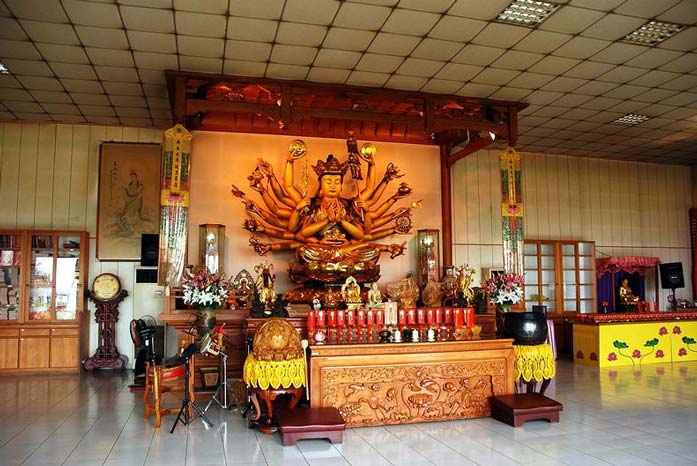 二楼设有“三圣殿”,供奉西方三圣,殿内宽敞素雅专办各种禅修、静坐及寺众自修之场所,空灵意境,清净无染。