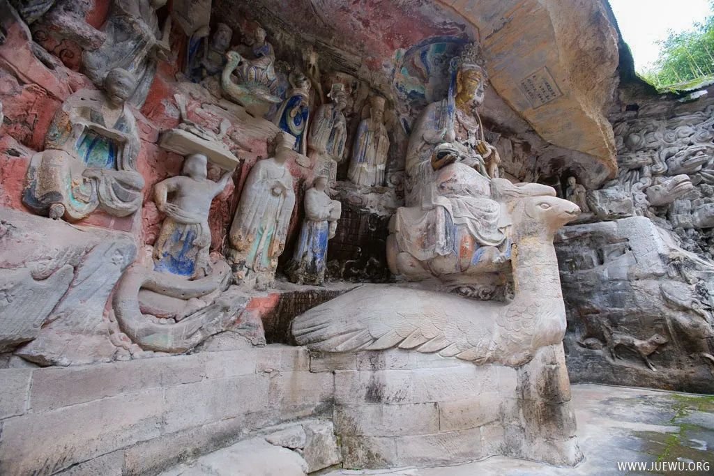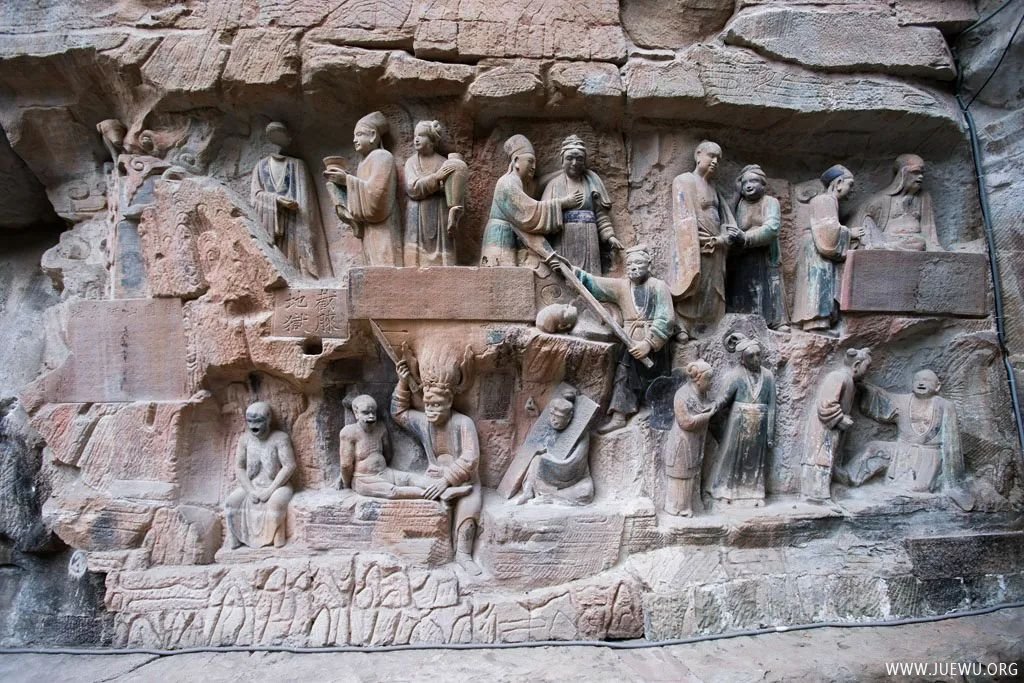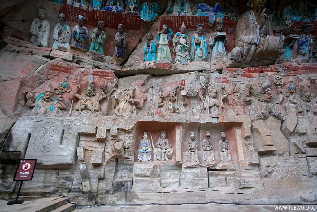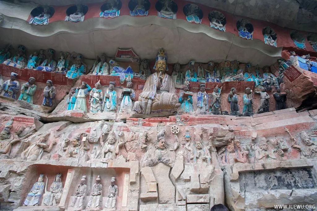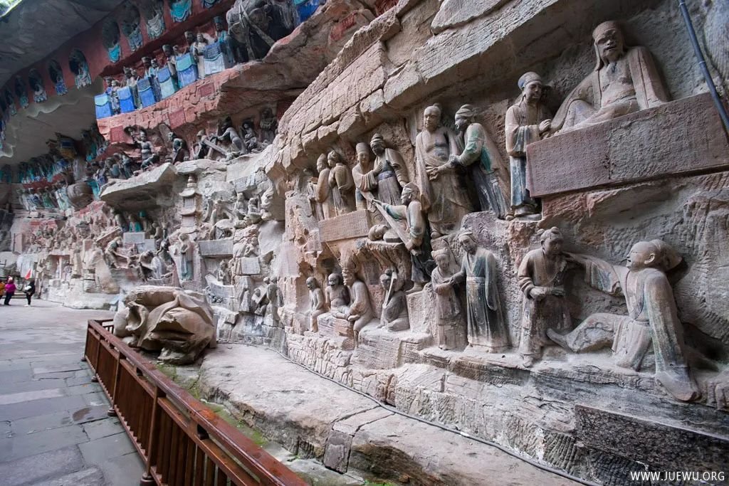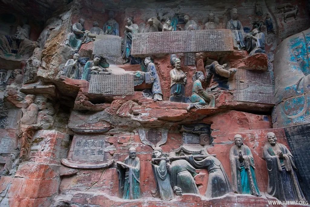 大足石刻最初开凿于初唐永徽年间,历经晚唐、五代,盛于两宋,明清时期亦有所增刻,最终形成了一处规模庞大,集中国石刻艺术精华之大成的石刻群,堪称中国晚期石窟艺术的代表。其规模宏大、雕刻精美、题材多样、内涵丰富、保存完整而著称于世;以集释(佛教)、道(道教)、儒(儒教)“三教”为一体,世所罕见。