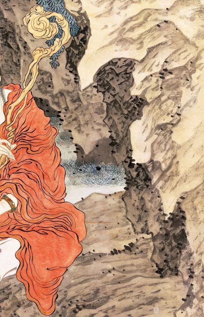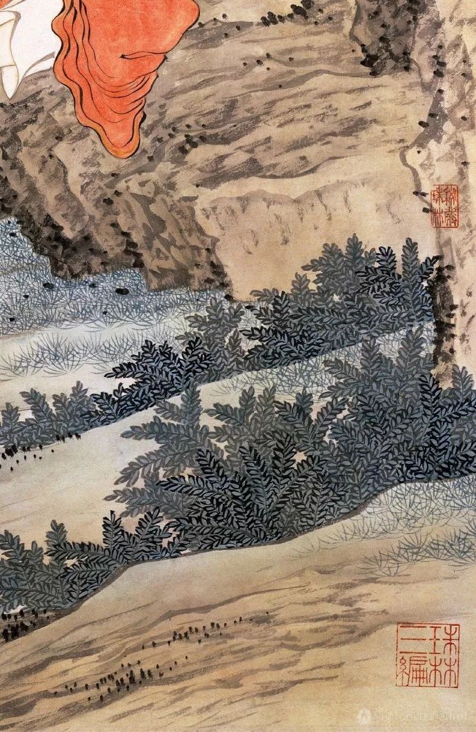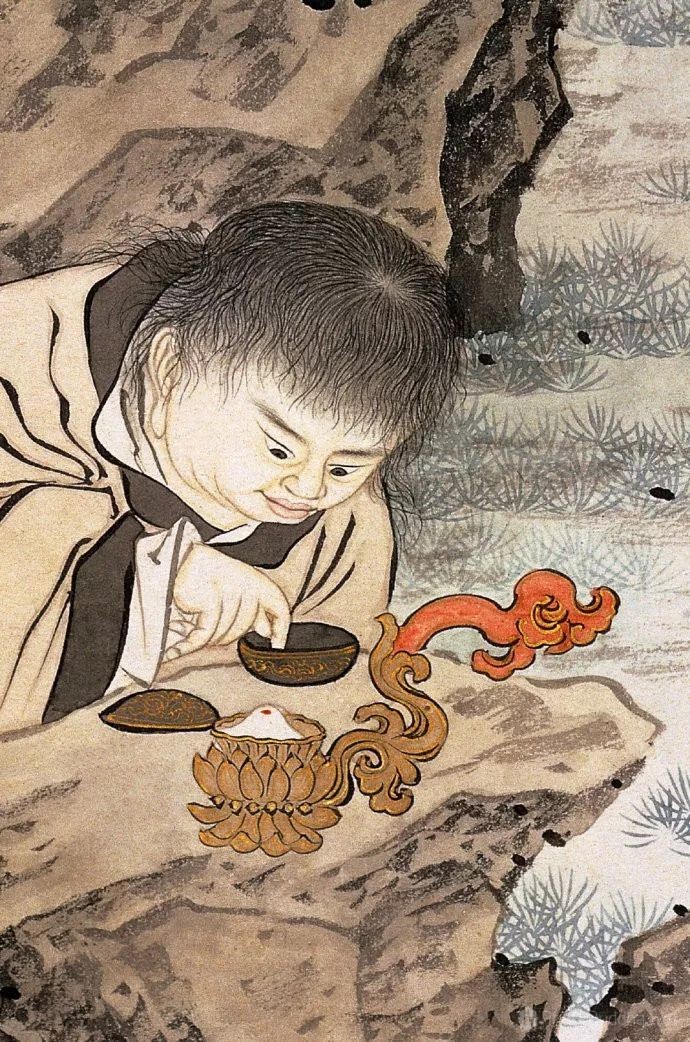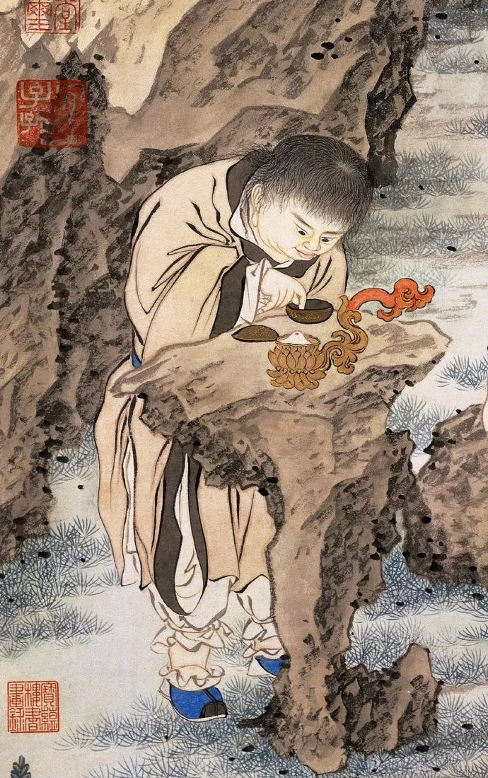 此图绘罗汉手持如意,面目慈祥,袒胸赤足,依山盘腿席地而坐。身侧的童子正在炷香,山上白云缭绕,隐露山岩树枝,其间云气弥漫。人物面部勾勒填色,神态惟妙惟肖,衣纹流畅自然,顿挫有致,疏密相间,山石虽似用漫不经意的轻松描绘,但实则严守法度,一丝不苟。上中有清高宗弘历题四言诗一首。