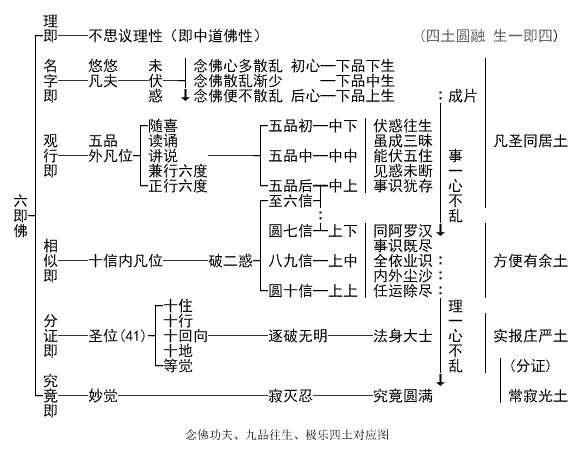 注:①、相似即十信内凡、观行即五品外凡、名字即悠悠凡夫,即善导大师所言:九品往生皆凡夫。②、圆教七信位同别教七住位,即阿罗汉水平,断见思惑,可凭自力竖出三界。③、极乐世界四土圆融,生一即四。善导大师言凡夫入报土,亦可按凡夫念佛水平浅深而言凡圣同居方便有余等化土。④、事一心不乱,在诸多祖师大德著述中,有时泛指,有时特指,当注意区分。下文引用的净空法师净界法师对弥陀要解一心不乱的定义,就是泛指,能伏惑伏烦恼就已经属于事一心不乱。而李炳南和黄念祖的文章中,就是特指,见思尽断,已达阿罗汉水平,可靠自力竖出三界的事一心。⑤、图中虚点表弥陀他力加持令念佛人功夫相对提升。名字位后心念佛人因佛力加持增胜故,可由功夫成片水平提升至观行位随喜品伏惑事一心不乱,入念佛三昧最浅者,可由三力见化佛,故决定往生。依《观经妙宗钞》可知,伏惑断惑事一心理一心皆称之为念佛三昧,念佛三昧实则范围极广,非单指断惑事一心不乱和理一心不乱。依蕅益大师《要解》可知,仗佛力加持增胜,相似位菩萨念佛力用同于靠自力修持同生性菩萨,即破无明之法身菩萨理一心不乱水平,故上三品往生者临终可见报佛(尊特身)来迎,得生实报土。再者,相似位以还念佛人,皆可仗佛力加持增胜,而令念佛力用皆有相对提升。此正显净土自他二力念佛法门优于其他自力法门的殊胜之处。